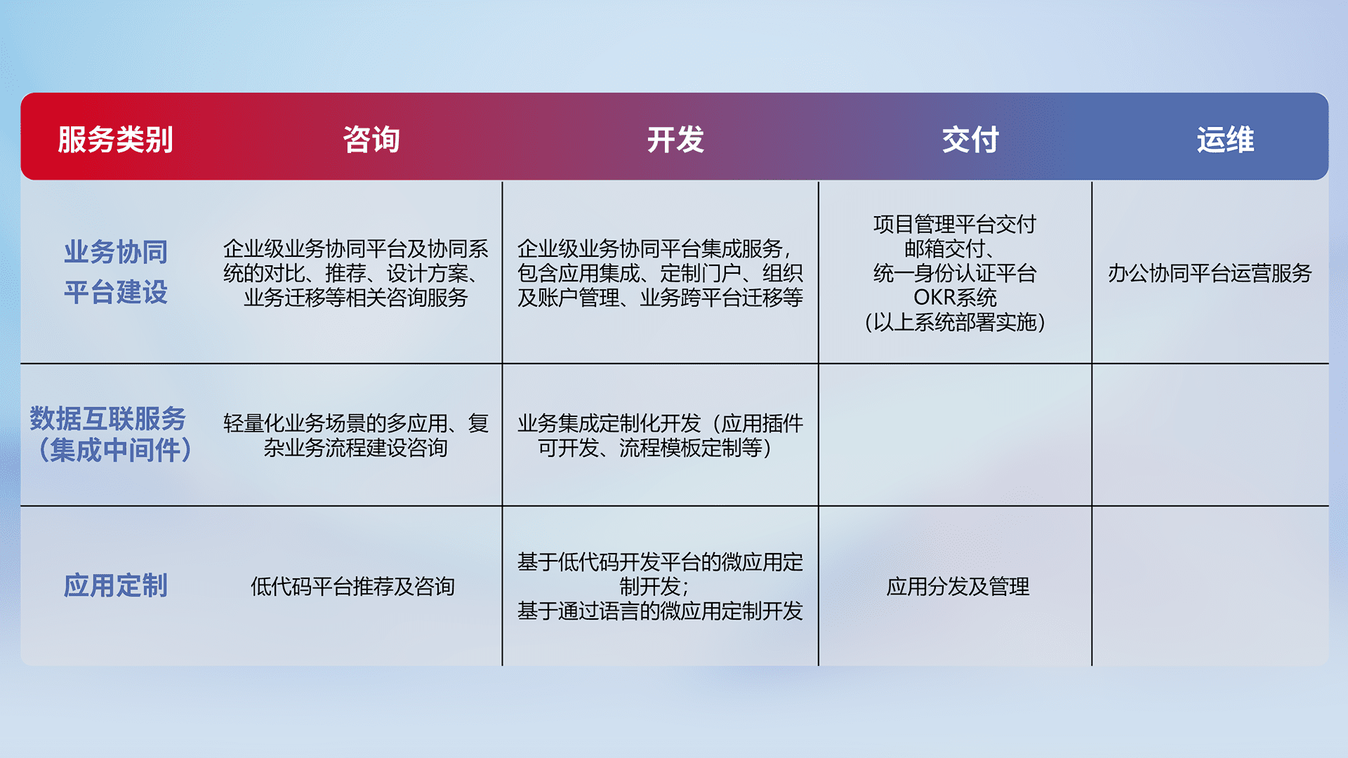 针对钉钉、、、、企微、、、、IDaas等平台级产品提供产品的规划、、方案、、、交付、、定制化开发等服务,,,实现如统一协同办公、、、智能客户服务、、混合会议管理、、、智能数据查询、、、、等业务场景,,,,实现数字化转型。。。