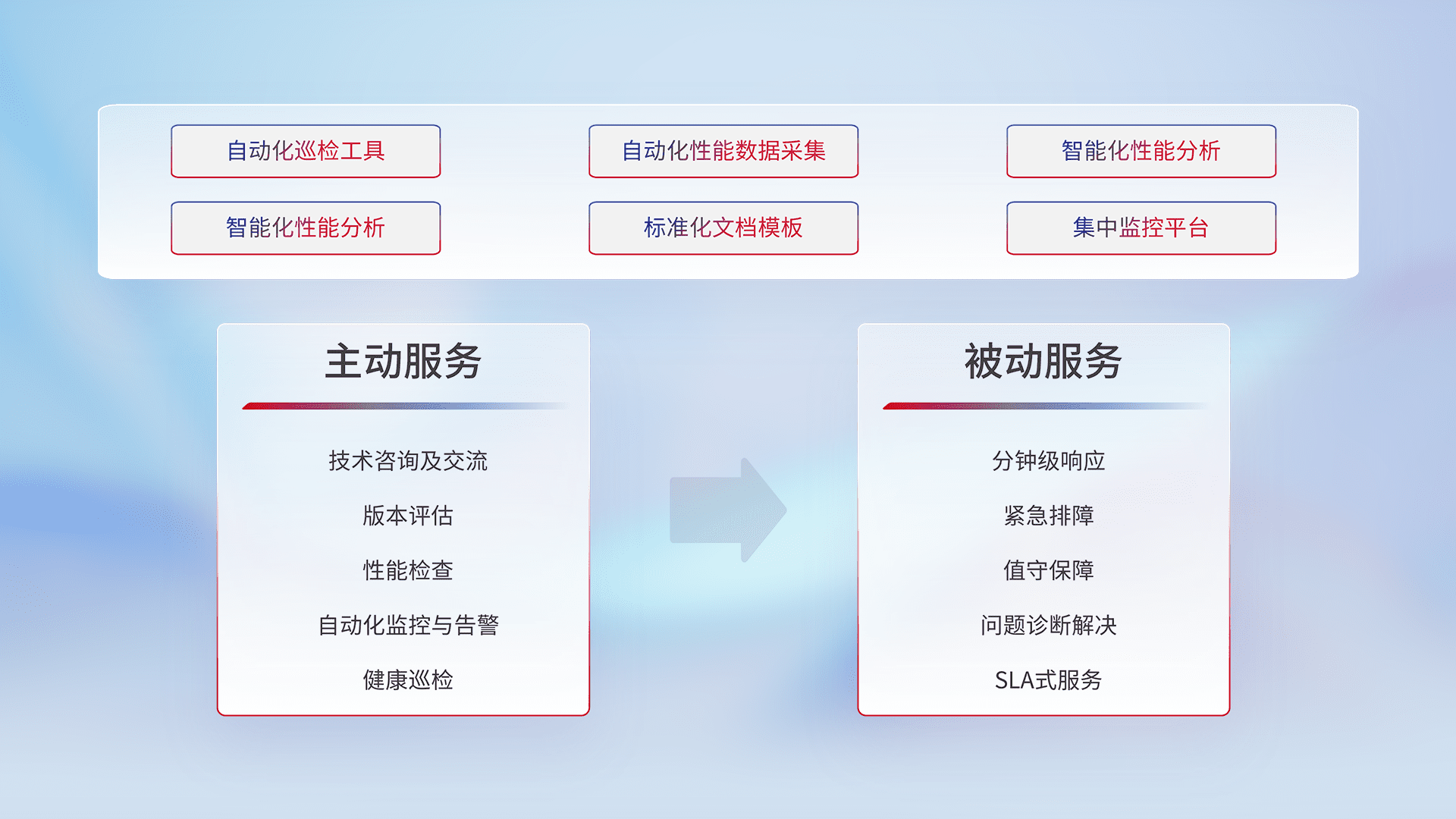 智能化工具和标准化文档,,,保障服务质量,,,提供主动服务(包含技术咨询、、、、版本评估、、、、性能检查、、自动化监控与告警、、、健康巡检)和被动服务包含(分钟级响应、、、、紧急排障、、、、值守保障、、、、问题诊断解决、、、、SLA服务)。。
