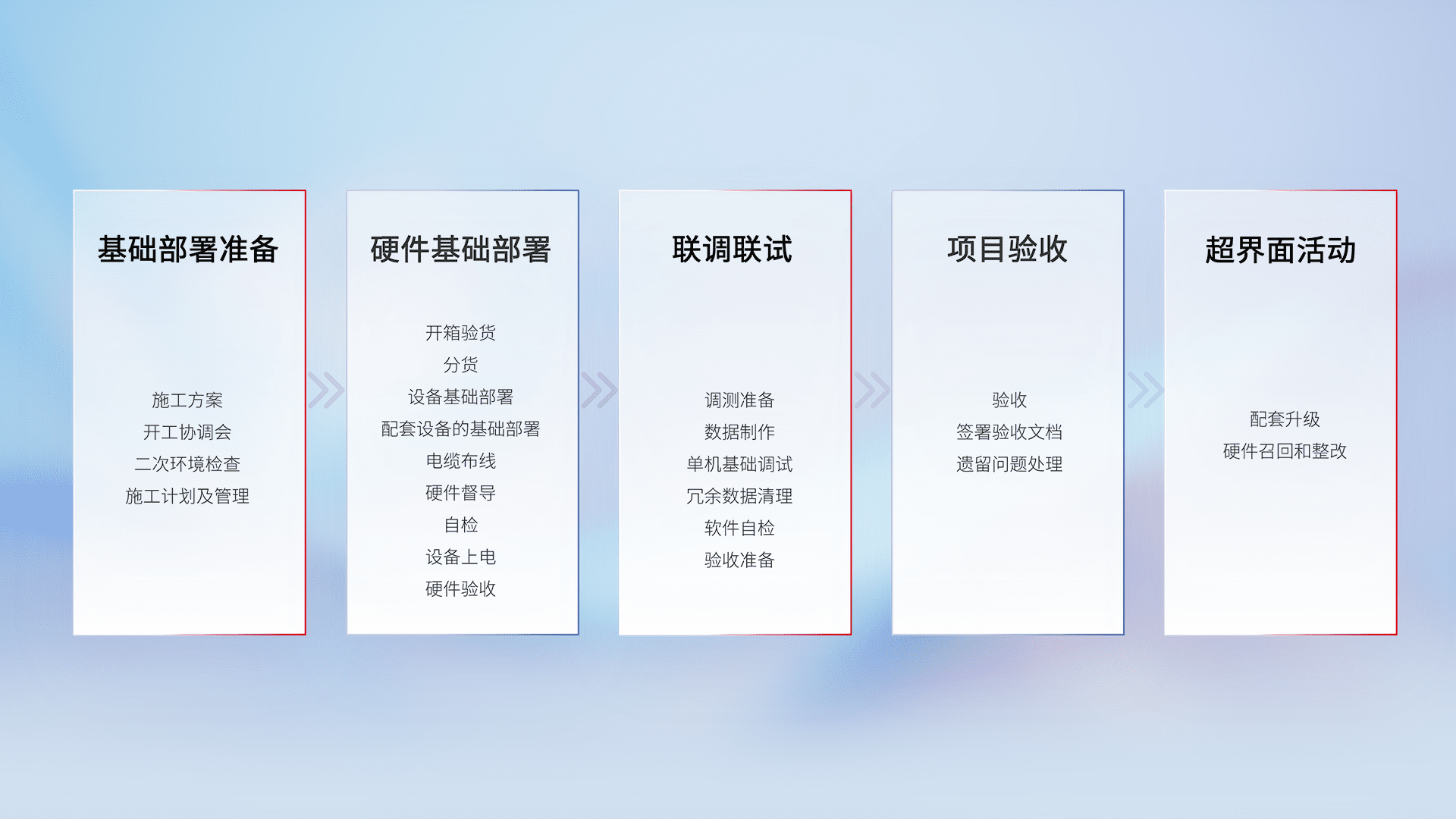 从基础部署准备、、硬件基础部署、、、联调联试、、、、项目验收、、越界面活动的全过程可追溯,,保证施工质量和进度。。。。